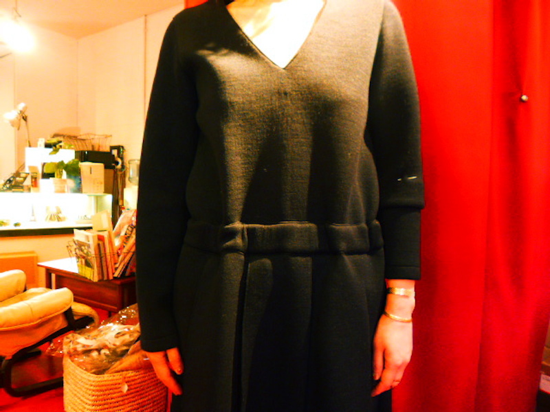 厚手のワンピース、ちょっと袖丈詰めしてみましょ、ピンを打ってバランスを見ます。